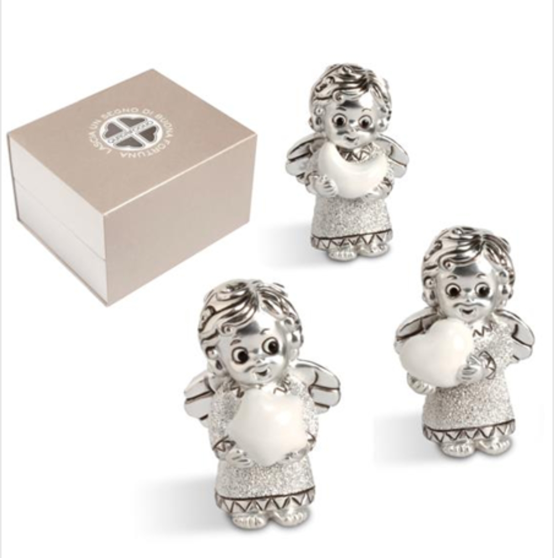 Angioletti con cuore stella e luna tra le mani, linea Brillante. Prodotto ideale per Bomboniere Originali.