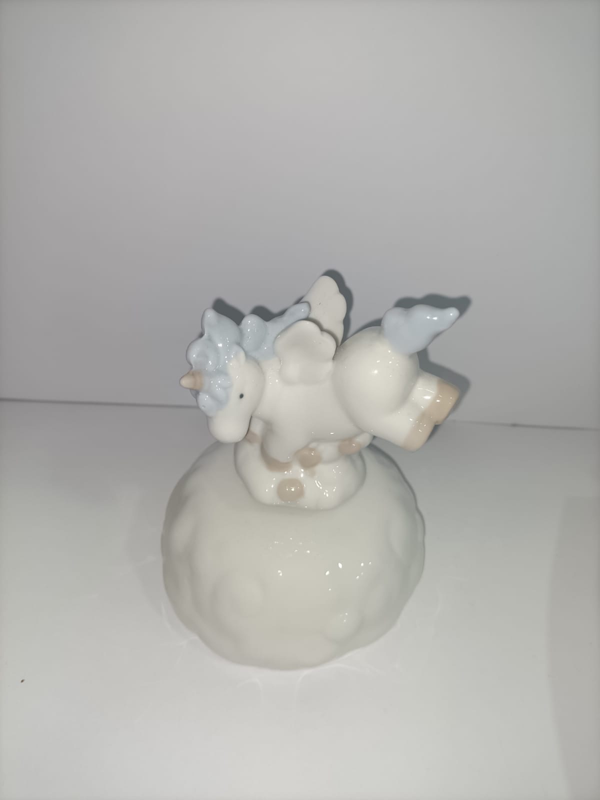 BOMBONIERA PER BIMBO,UNICORNO CARILLON IN CERAMICA BIANCA CON DETTAGLI CELESTE E BEIGE,PRODOTTO IDEALE PER BATTESIMO,NASCITA .