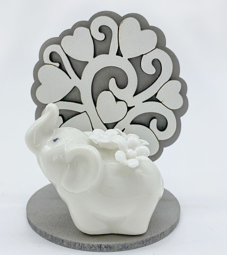 Albero della vita in legno, in doppio colore tortora e bianco, con base rotonda su cui è presente un piccolo elefantino bianco in porcellana raffigurato con dei delicati fiorellini .