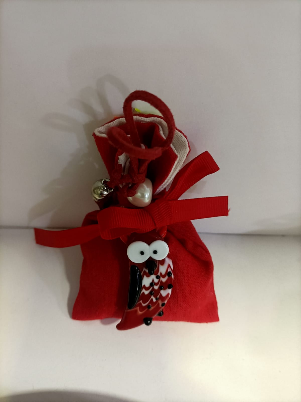 GUFETTO IN VETRO APPLICATO SU SACCHETTO ROSSO CON FIOCCO E NAPPINA ROSSINĀ DIMENSIONI SACCHETTO 10.5 CM X 7.5 CM DIMENSIONI GUFETTO H 6 CM X 2 CM COLORE BIANCO/ROSSO/NERO