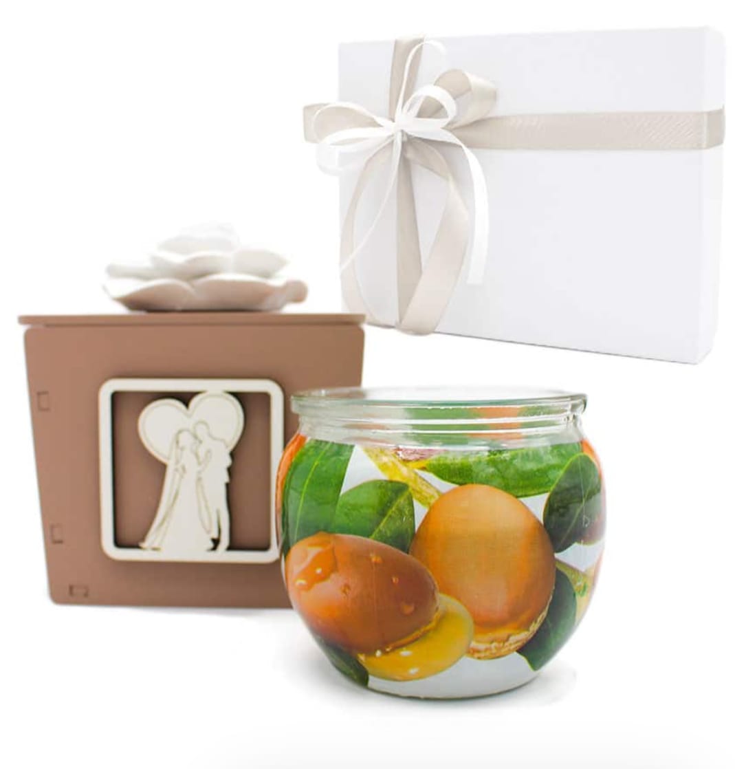 REGALA QUESTA Bomboniera unica ed elegante ai tuoi invitati. Questa candela profumata con portacandele in legno colore tortora è decorata con sposi vestiti con abiti eleganti che si abbracciano racchiusi in un cuore. Il coperchio è decorato con una rosa in ceramica bianca con strass centrale. Un’idea originale ed elegante per i tuoi invitati.