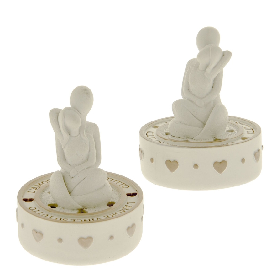 Scegli queste bellissime riproduzioni artistiche in resina, raffiguranti una coppia abbracciata stilizzata rappresentata seduta in due varianti assortite. Sulla base che sorregge la statuina è montato il modulo led che trasforma la composizione in una graziosa lucetta da tavolo, grazie ai fori a forma di cuore presenti sulla base, intorno a cui gira la frase “L’Amore vince su tutto“.