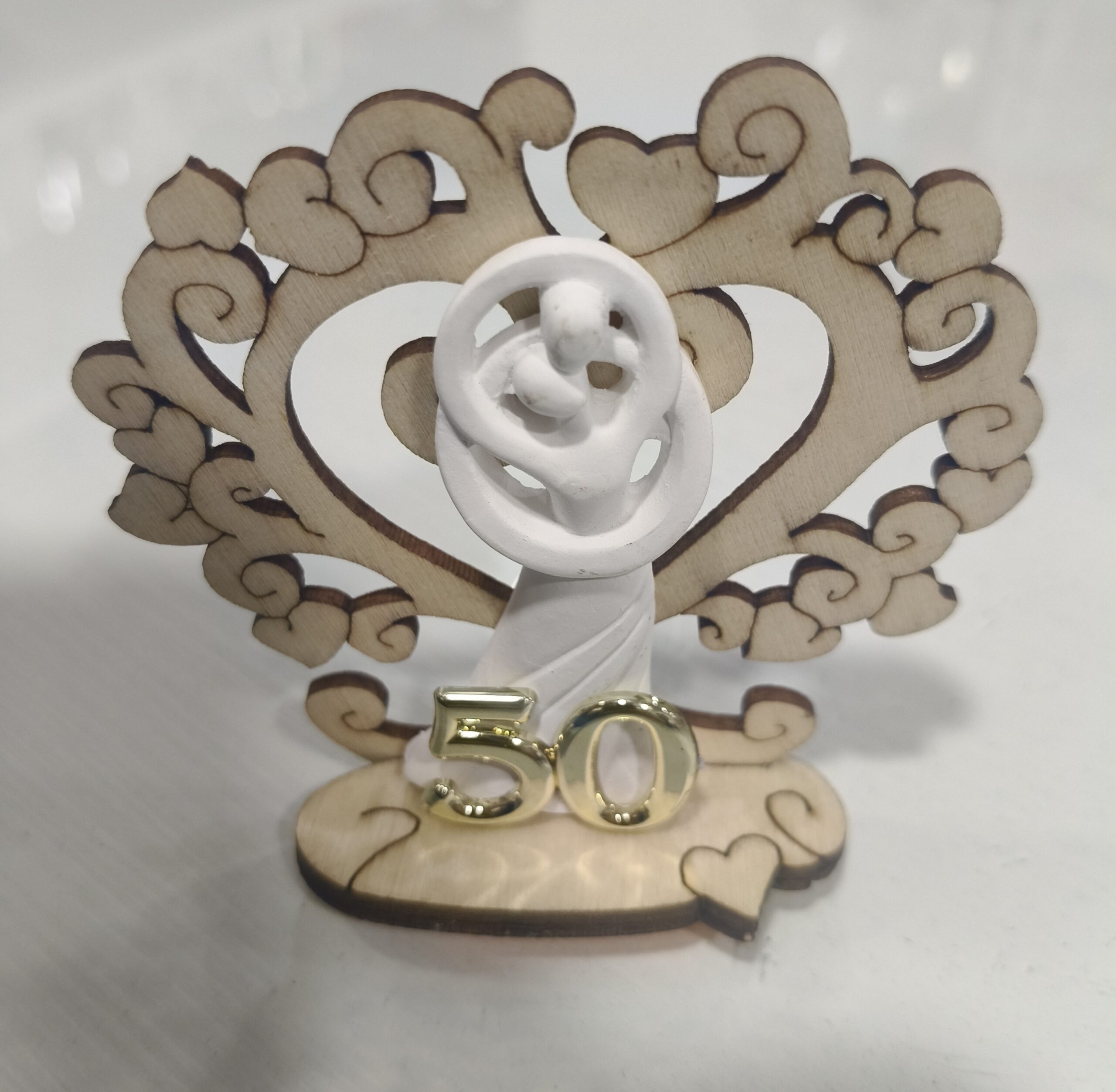 Bomboniere 50° anniversario, coppia Sposi in gesso con Albero della Vita a forma di cuore su base in legno. misura 7 h cm 7 cm larghezza .