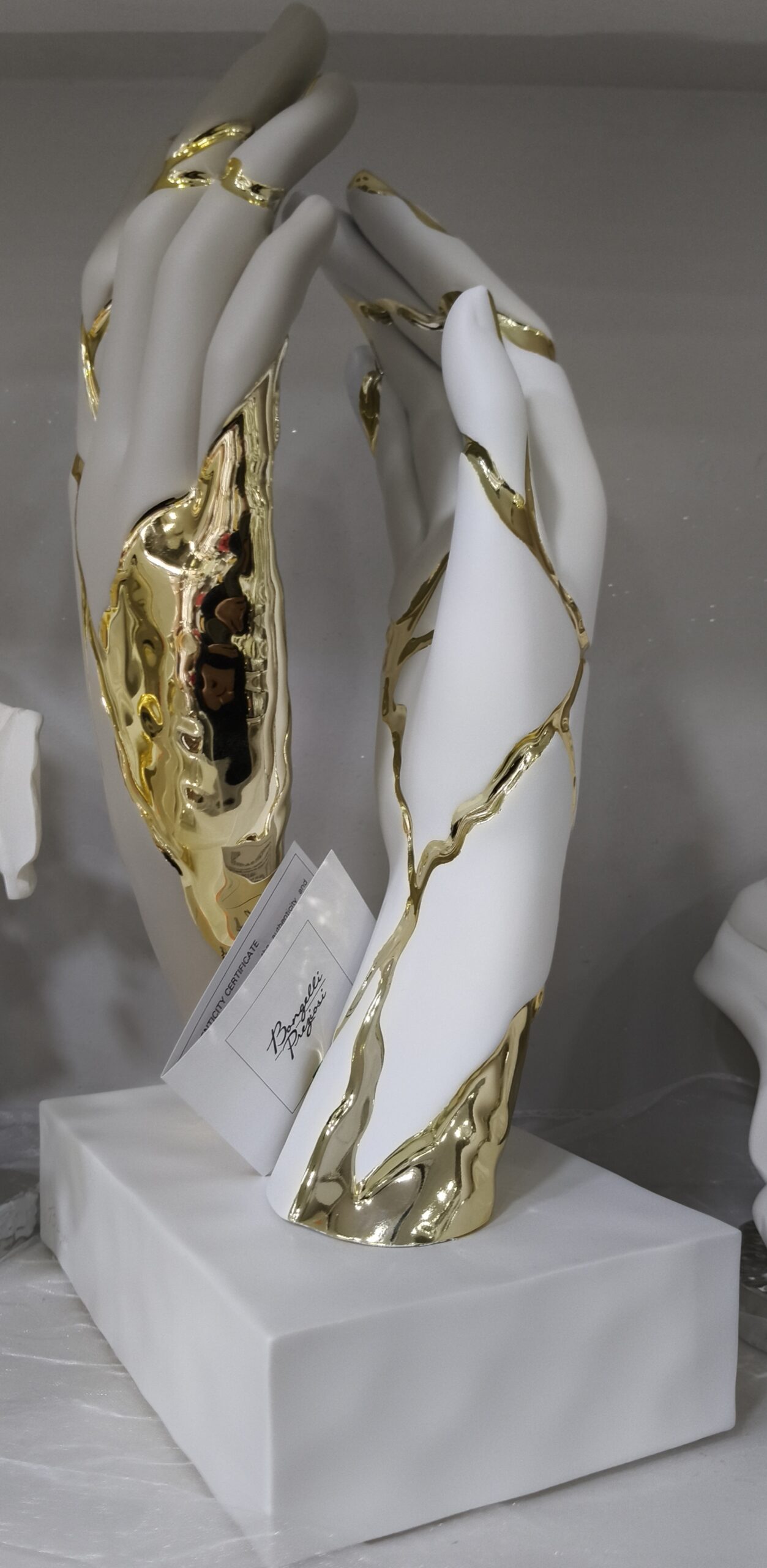 Bongelli scultura mani h.38 tortora /bianco e oro base bianca.