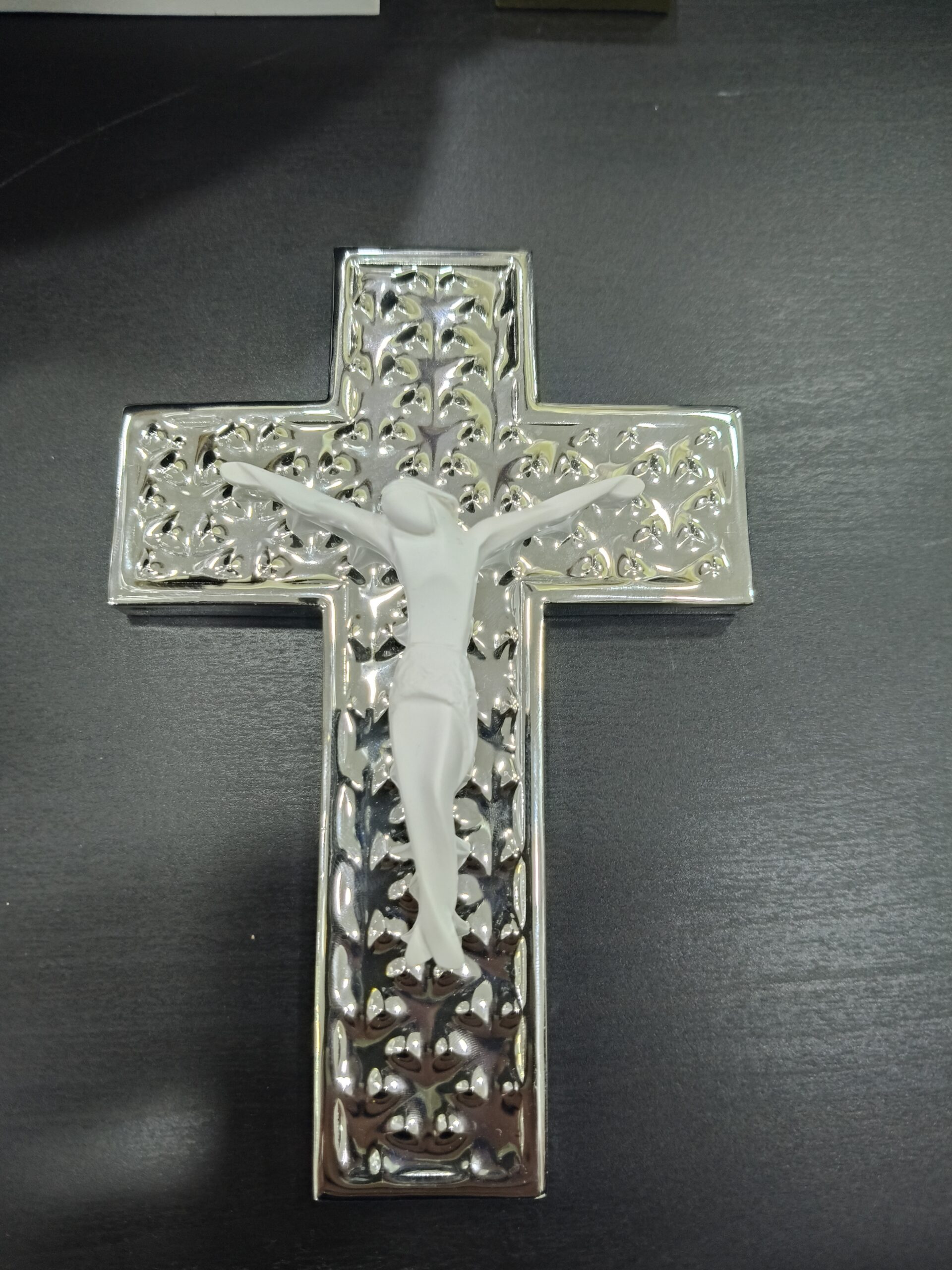 Elegante crocifisso in polvere di marmo nei colori tortora bianco ,bianco e argento,oro e bianco,argento e bianco prodotti eleganti e made in per arredare i tuoi spazi con un simbolo sacro dallo stile moderno.