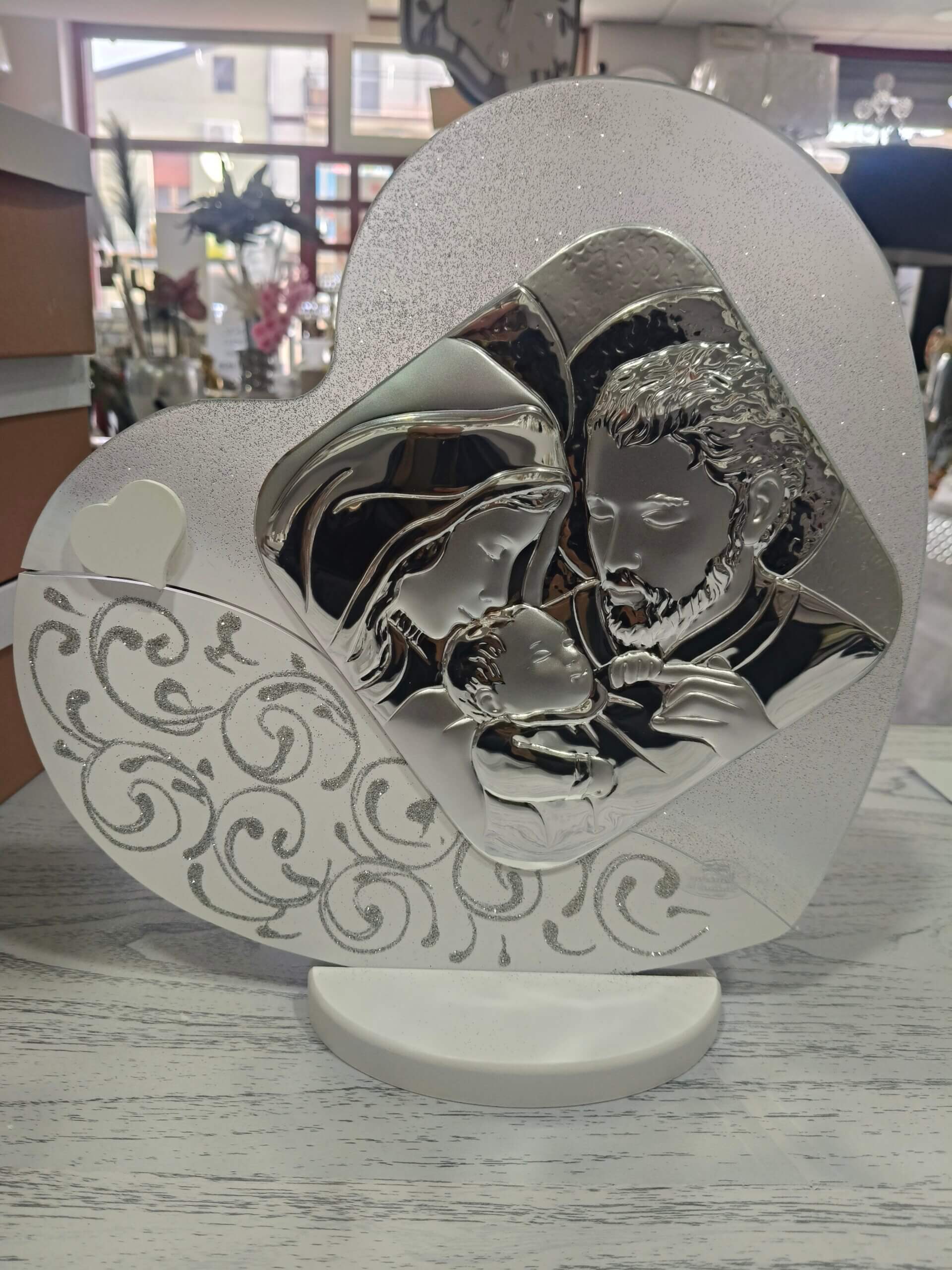 Cuore Sacra famiglia quadro da appoggio in argento base 14 cm altezza 31 cm larghezza 30cm prodotto 100%made in Italy in argento e vetro foglia argento