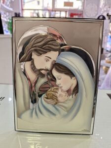 Icona religiosa in argento Sacra Famiglia smaltata . Icona religiosa con immagine della Sacra Famiglia prodotto made in Italy brand valenti argenti misura h17,5 x lar 13,5.
