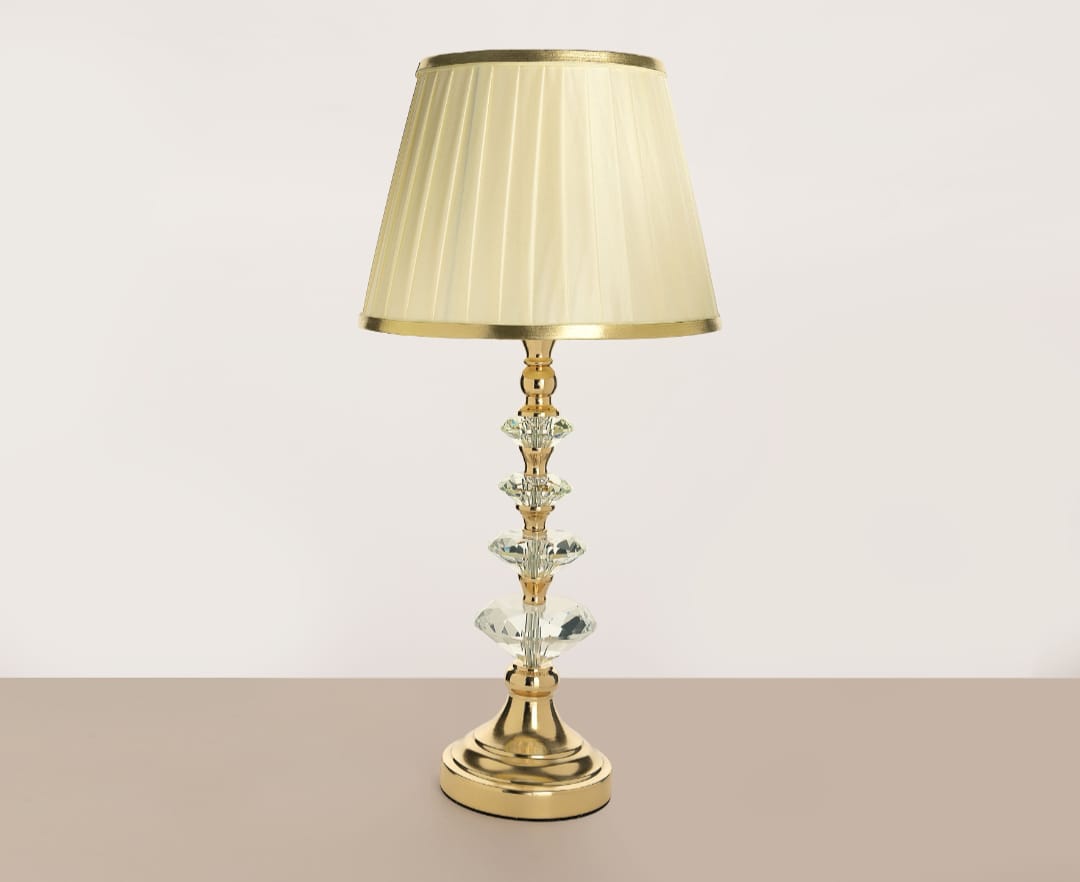 SPETTACOLARE LAMPADA COLOR ORO CON CRISTALLO PRODOTTO IDEALE PER RENDERE UNICO IL TUO AMBIENTE CON CAPPELLO IN TESSUTO E DETTAGLI ORO H 58 CM X 28 CM ADATTA PER CHI VUOLE DISTINGUERSI CON DEI COMPLEMENTI CHE EMOZIONANO