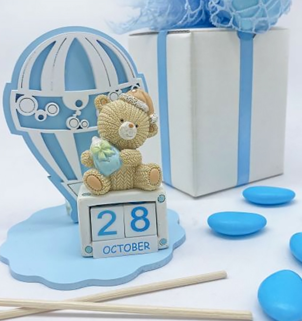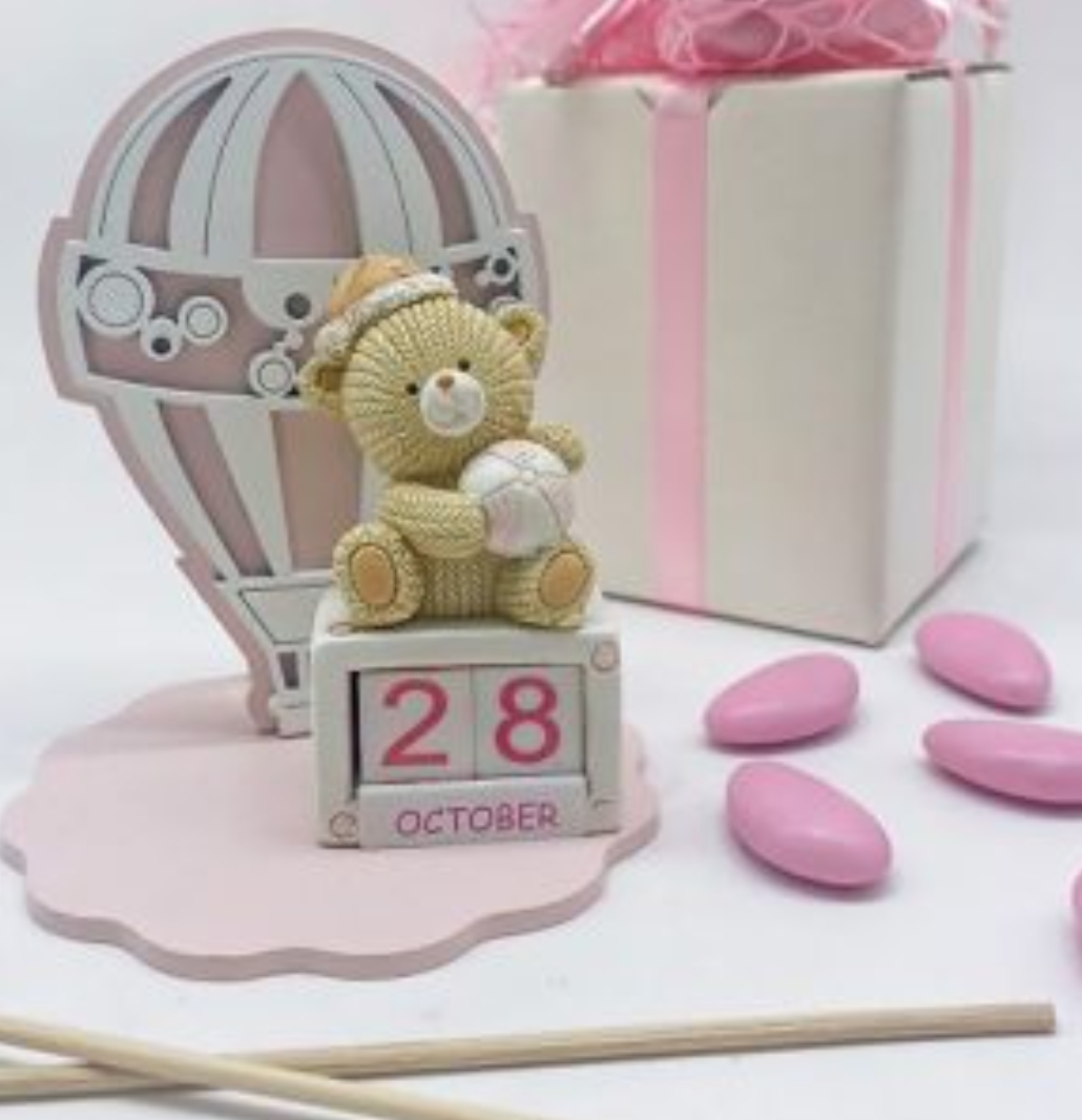 Profumatore mongolfiera orsetto cieleste con calendario possibilitร di richiederlo anche in rosa รจ unโidea particolare e dal design unico e raffinato.ย Dimensione di 10,5 x 9 cm, questo profumatore รจ realizzato inย resinaย eย legno, e si distingue per i suoi dolciย colori cieleste e bianco, ideale per un maschietto. Il calendarioย lo rende non solo una bomboniera originaleย ma ancheย utileย e pratica.