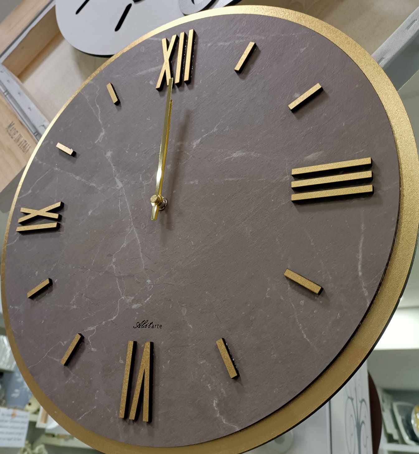 Orologio ardesia colore tortora effetto marmo in kerlite giro esterno oro numeri e lancette oro con possibilità di personalizzarle anche in argento su prenotazione disponibili diametro 40/60/80 prodotto made in italy