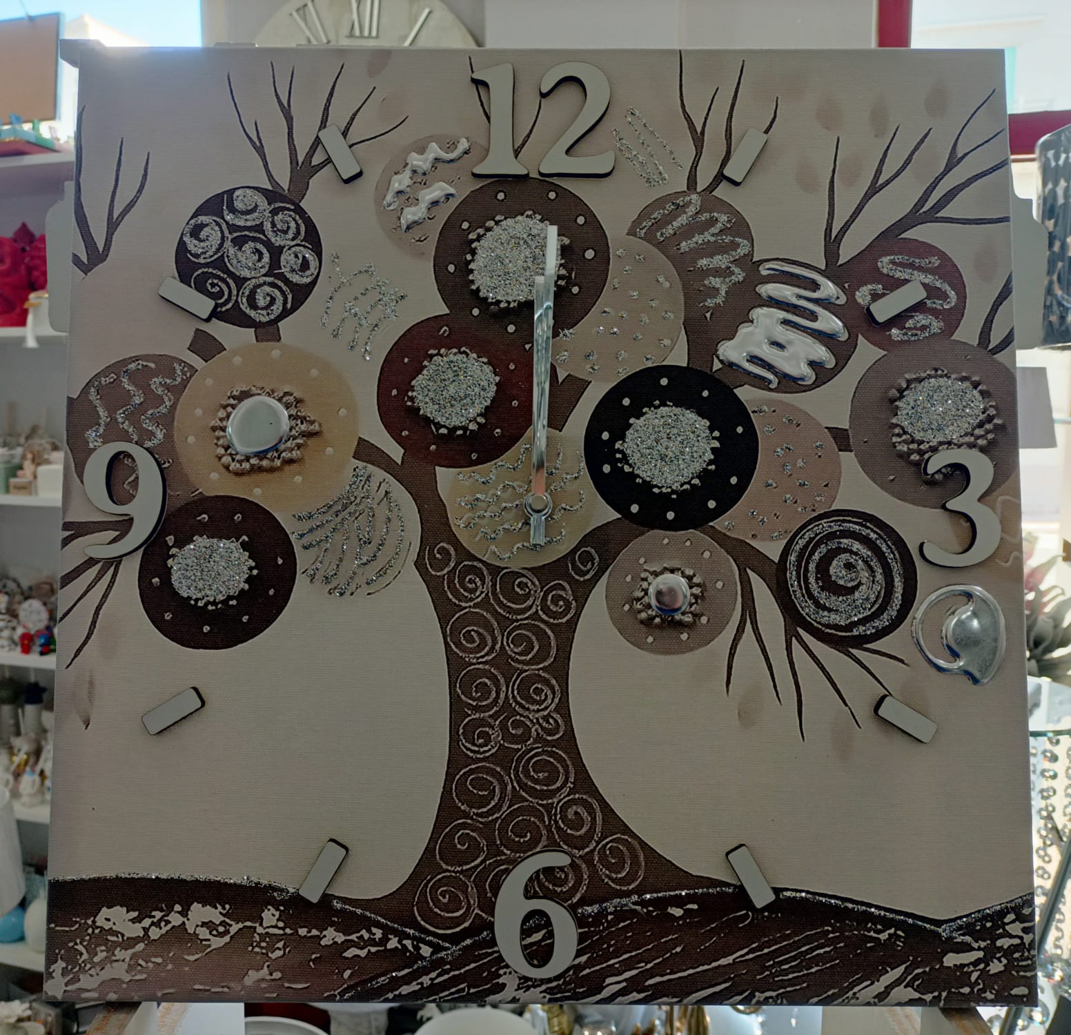 Il nostro orologio decorativo da parete e’ realizzato su pannello da 3 mm in fibra di legno con stampa decorativa di alta qualita’ raffigurante albero della vita/ quercia con dettagli in glitter argento e piombo. Complementi d’arredo che combinano funzionalita’ e bellezza. Orologi da parete che uniscono la praticita’ di controllare l’ora alzando lo sguardo, al piacere di vedere la tua parete illuminata da una piccola opera d’arte. Le misure disponibili dell’orologio sono 50x50cm, per arredare la tua casa in modo elegante e originale. Adatto per tutti gli stili di casa, dalla camera da letto alla cucina, dal soggiorno alla sala da pranzo, ogni locale puo’ essere impreziosito da un orologio di questo tipo, molto utile anche per ambienti di lavoro. Garanzia di prodotti Made in Italy. Orologio con movimento a quarzo alimentato a batteria, e’ necessaria 1 batteria alcalina AA, non fornita.