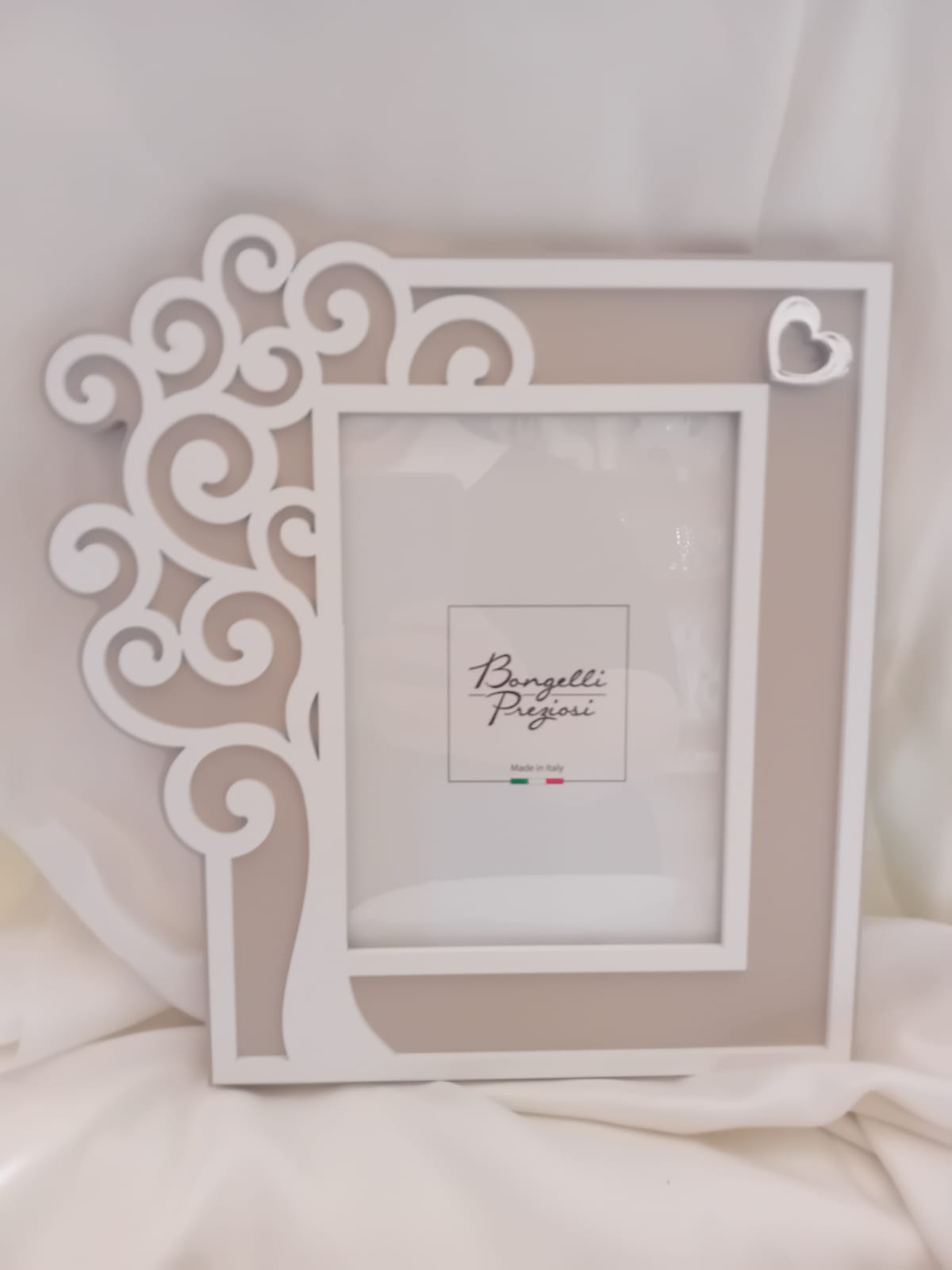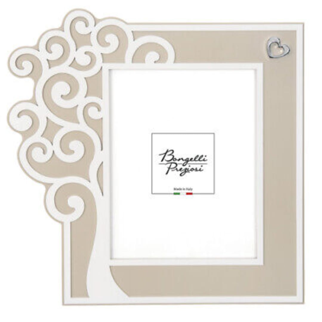 PORTAFOTO ALBERO VITA CON DETTAGLIO CUORE IN ARGENTO. MATERIALE LEGNO COLORE BIANCO E NOCCIOLA. PRODUZIONE ITALIANO BRAND BONGELLI MISURA ESTERNA 30 CM CIR. X 28 CM CIR.  INTERNA 18CM X12.5 CM.IDEALE PER REGALO DI MATRIMONIO O PER FESTEGGIARE UN EVENTO SPECIALE.