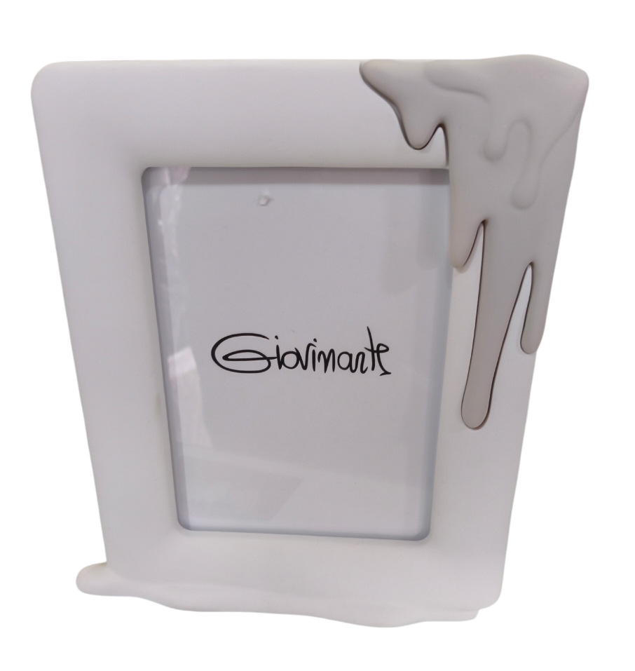 Elegante portafoto bianco in polvere di marmo con dettaglio colatura colore tortora prodotto dallo stile unico che rappresenta l’eccellenza del made in Italy ideale per ambienti raffinati e moderni per dare un tocco di particolarità al vostro arredamento.