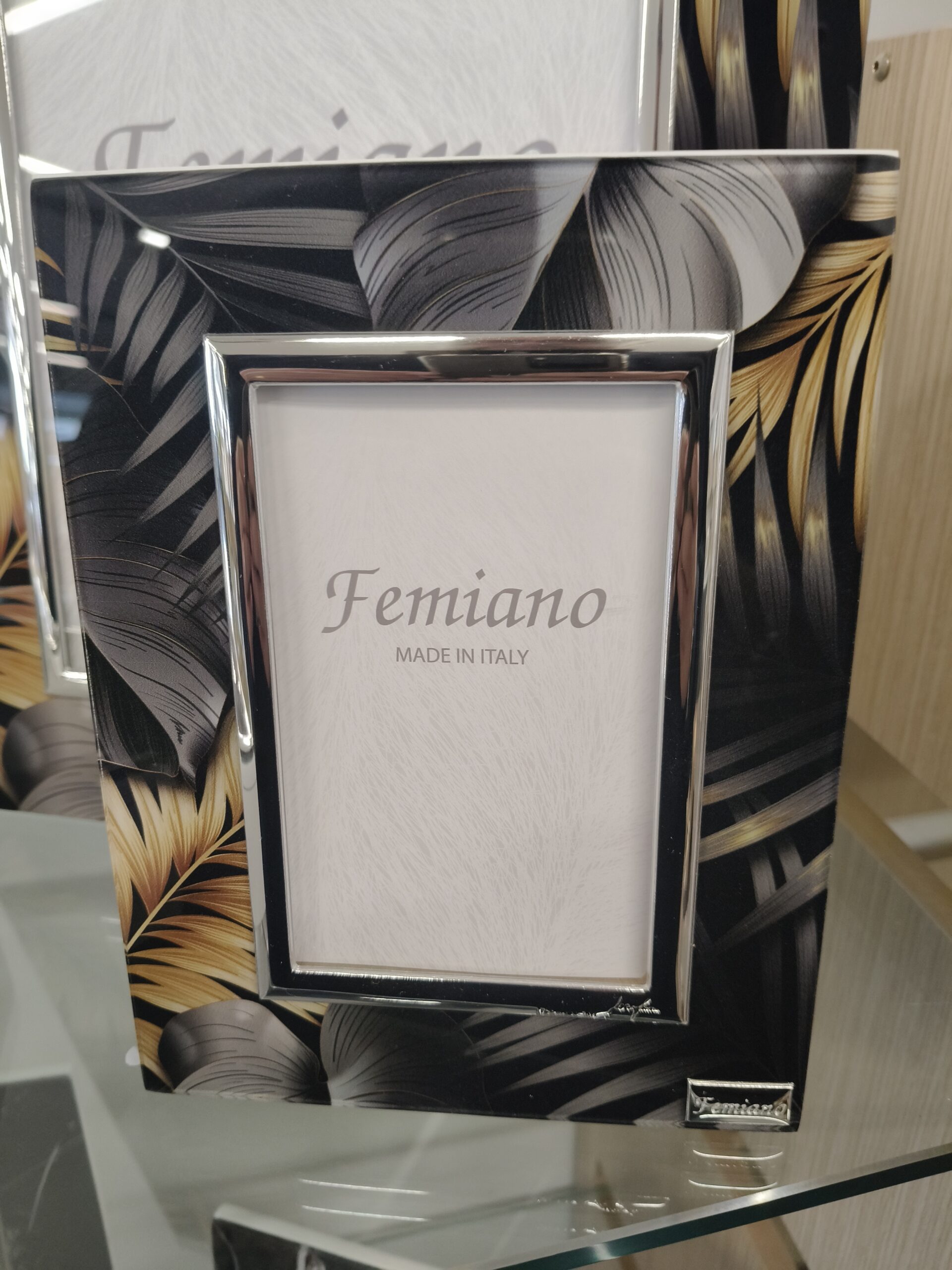Portafoto in legno e vetro molato effetto mostera e palme colori nero,oro, grigioย ย fotografia interna 8.5l x13 h cm verticale o orizzontale. Dettagli in argento, retro in legno. Made in Italy
