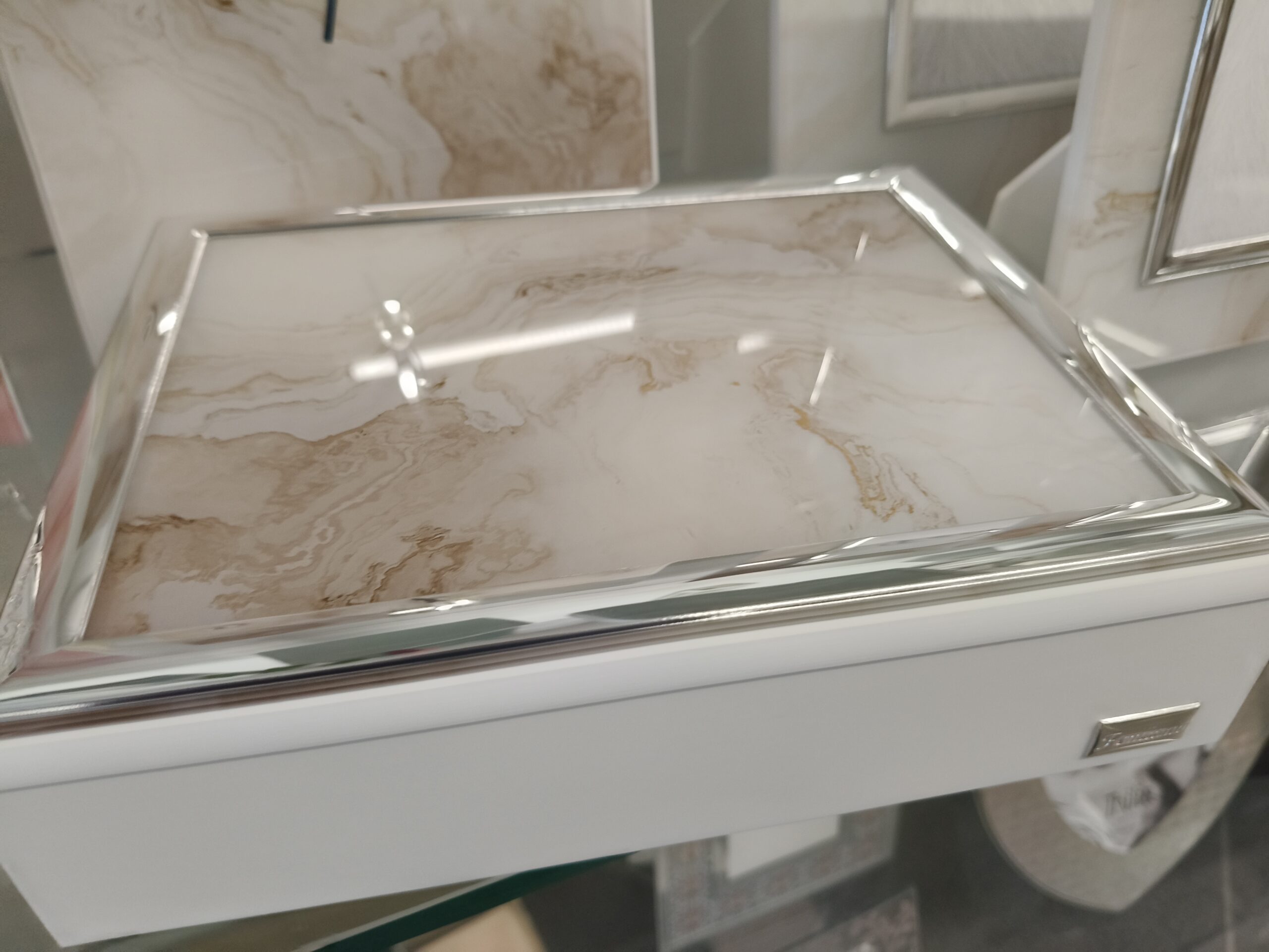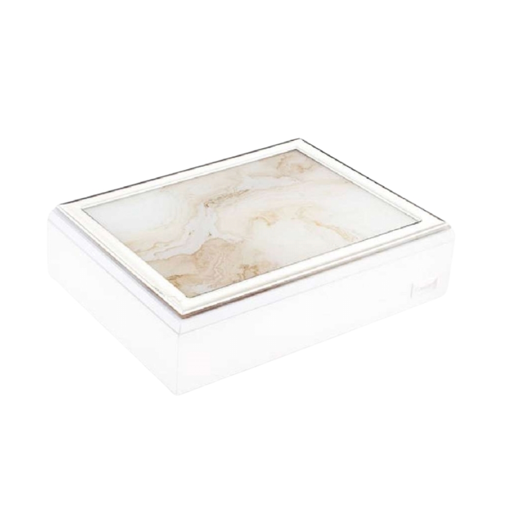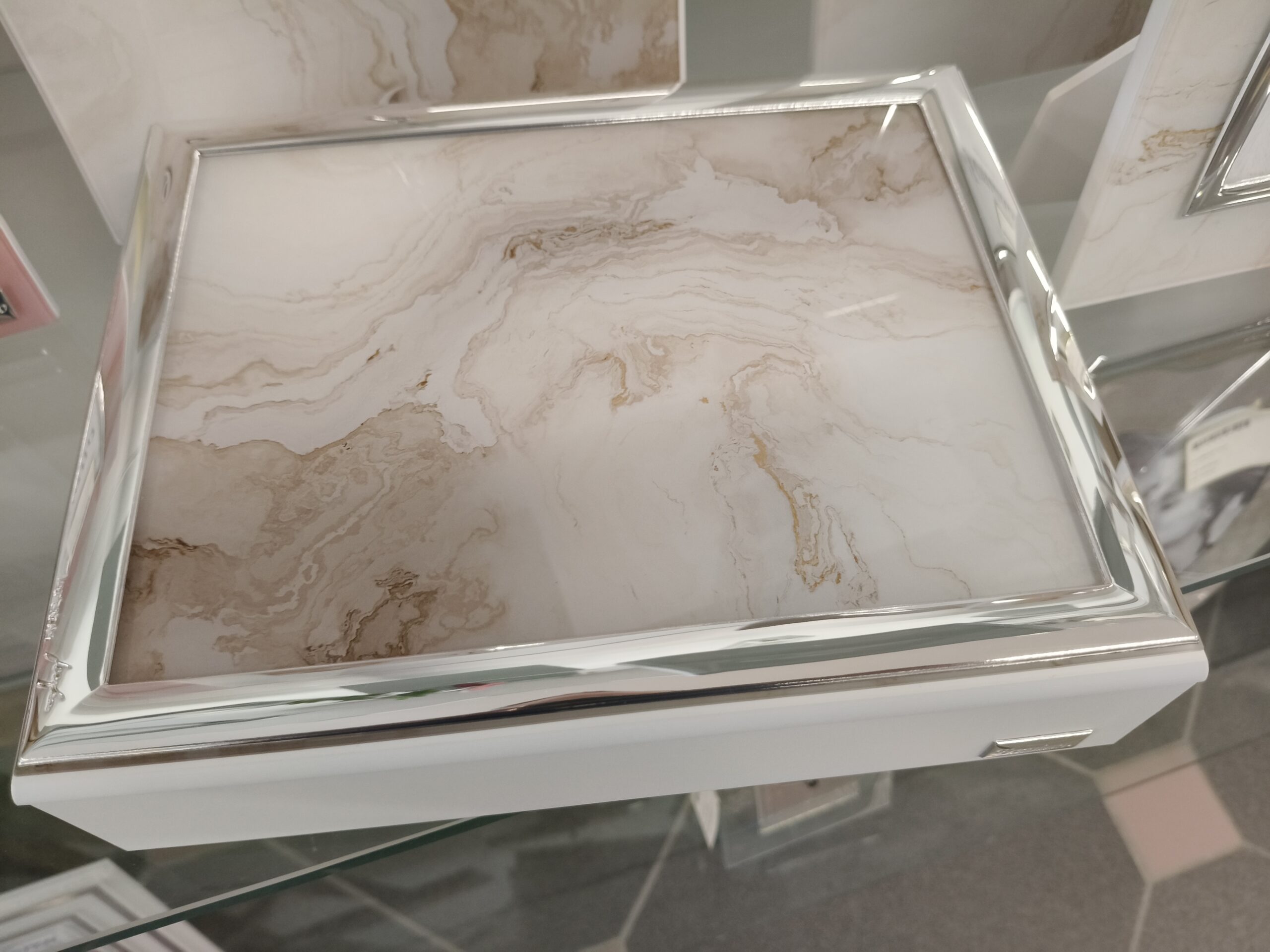 Elegante Portagioie con apertura a cofanetto effetto marmo nei colori tortora e bianco in vetro molato in legno con dettaglio in argento nelle mis 20×25 ideale per arredare con gusto i tuoi ambienti .
