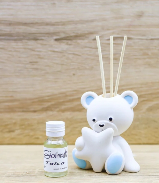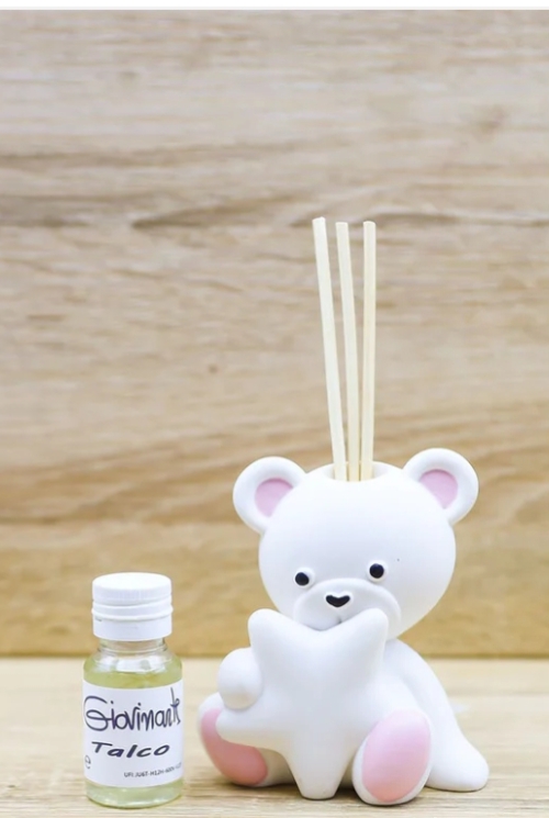 Profumatore di un dolce orsetto con orecchie e zampe rosa ed una stella tra le zampe.Possibilita di scegliere la variante in celeste prodotto made in Italy materie polvere di marmo grandezza h9 cm il prodotto viene venduto con box da bomboniera profumo e bacchette.