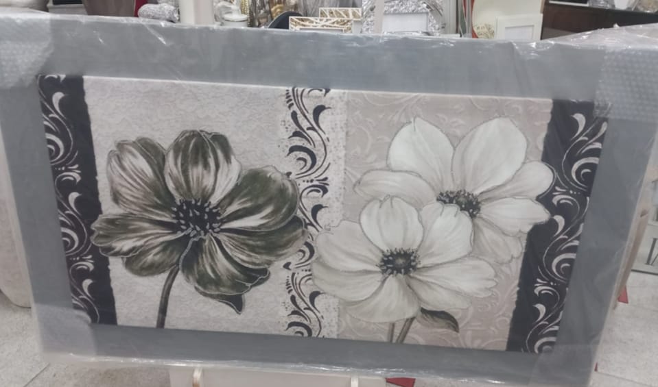 QUADEO IN LEGNO E TELEA  RAFFIGURANTE  FIORE NERO E BIANCO CON DETTAGLI CON GLITTER ARGENTO MISURA MASSIMO INGOMBRO 120X70CM PRODOTTO MADE IN ITALY