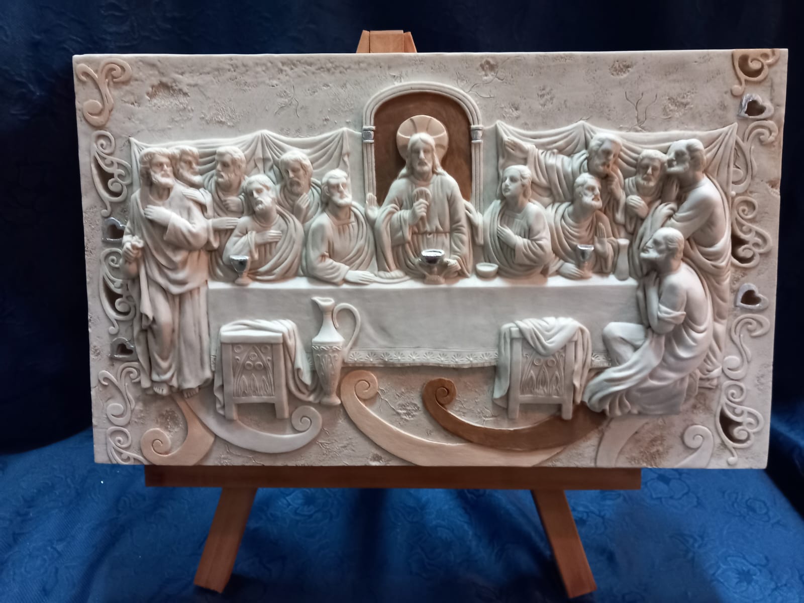 QUADRO ULTIMA CENA CON COLORI MODERNI/ CONTEMPORANI E DETTAGLI ARGENTO IL QUADRO SI PUO SIA APPENDERE CHE POGGIARE SU CAVALLETTO IN LEGNO FORNITO CON IL PRODOTTO REGALO RAFFINATO ED ELEGANTE MISURA 28X36 CM