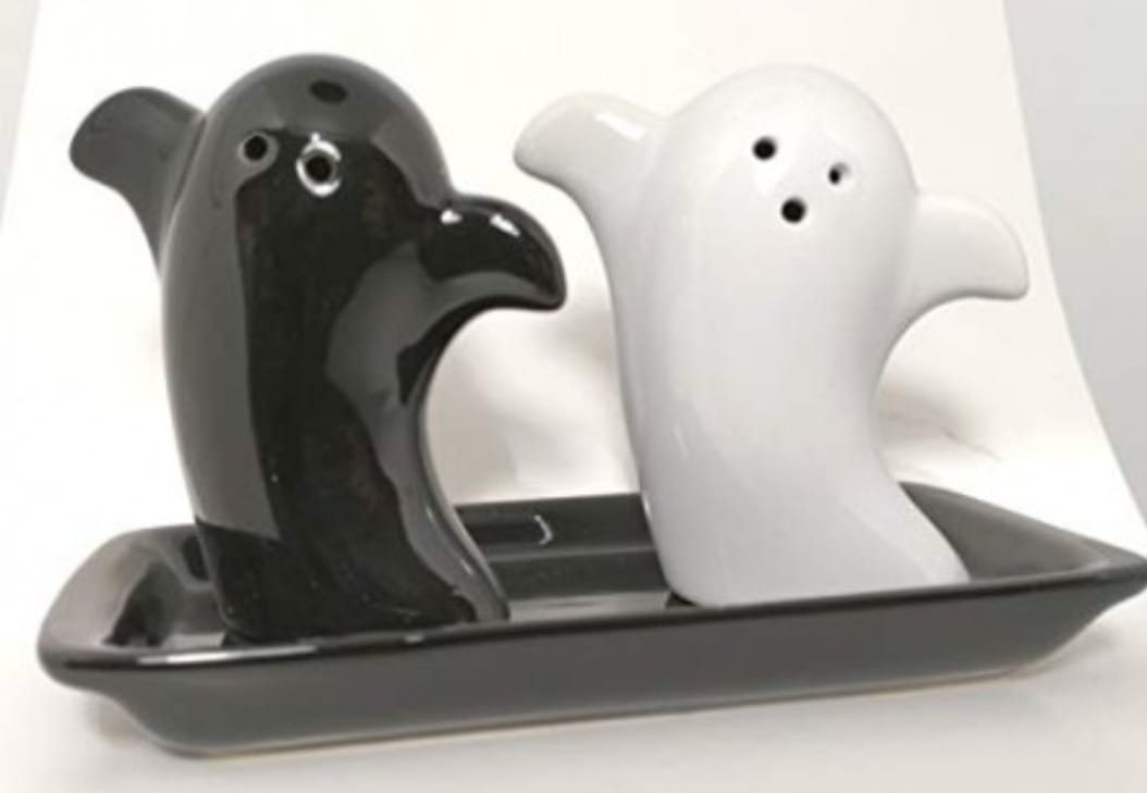 BOMBONIERA UTILE SALE EÂ PEPE A FORMA DI FANTASMINI BIANCO E NERO CON VASSOIO IN PORCELLANA ALTEZZA FANTASMINI 8 CM DIMENSIONI VASSOIO 15 CM X 7.5 CM