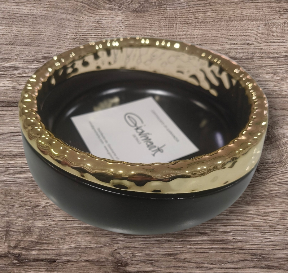 - Design Bicolore: La base nera opaca, dal profilo liscio e moderno, si sposa perfettamente con il bordo superiore dorato, creando un effetto visivo di grande impatto.
